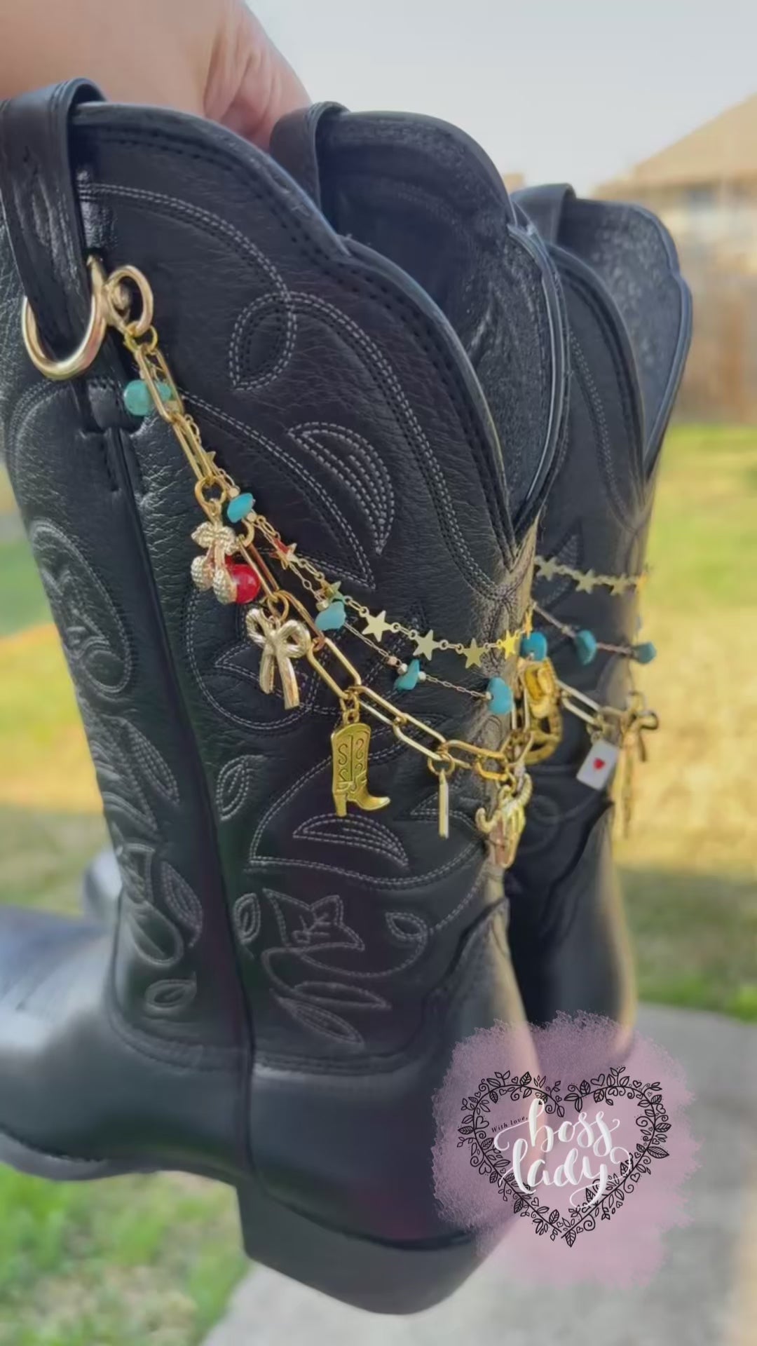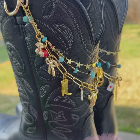These layered western boot chains are designed to add bold Texas cowgirl energy to any outfit. Featuring gold plated chains, turquoise stone accents, and a curated mix of western-inspired charms, this boot jewelry instantly elevates your look for Houston Rodeo season, Texas country concerts, festivals, and western nights out.